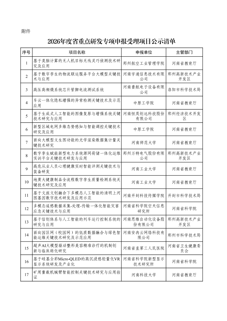 根据《河南省科技计划项目信息公开管理办法》《河南省科学技术厅 河南省财政厅关于组织申报2026年度河南省重点研发专项的通知》要求,现对2026年度省重点研发专项受理项目予以公示(详见附件),公示期为5个工作日,自2025年11月17日至11月21日。