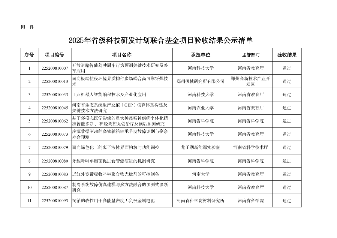 根据《河南省科技计划项目管理办法(试行)》和《河南省科技计划项目信息公开管理办法》等有关要求,现将2025年省级科技研发计划联合基金项目验收结果予以公示,公示期为5个工作日(2025年12月30日—2026年1月6日)。公示期间若有异议,请向省科技厅提交实名书面异议材料。