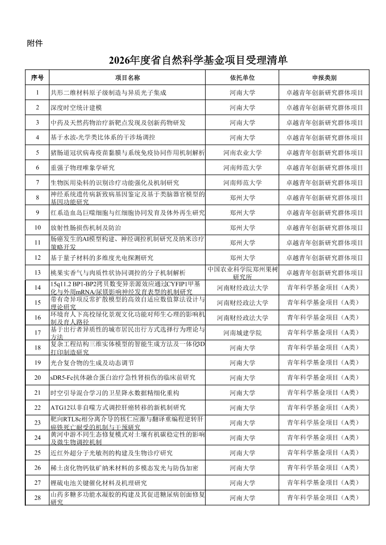 根据《河南省科技计划项目信息公开管理办法》《河南省科学技术厅 河南省财政厅关于组织申报2026年度省自然科学基金项目的通知》要求,现对2026年度省自然科学基金项目受理情况予以公示(详见附件),公示期为5个工作日,自2026年1月5日至9日。公示期间,如有异议请实名向省科技厅提供书面材料。